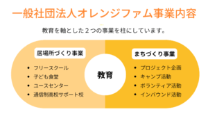 一般社団法人オレンジファムでは、教育を軸とした「居場所づくり事業」と「まちづくり事業」の二つの事業を柱に活動しています。